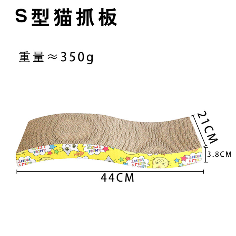 Product: S-type cat scratch board Item no: QBH - 010 Main material: corrugated paper Product size: 44*21*3.8cm Weight: 0.38 kg 48 PC\CTNCarton Size:70*46*67cmG.W.: 19.2KG