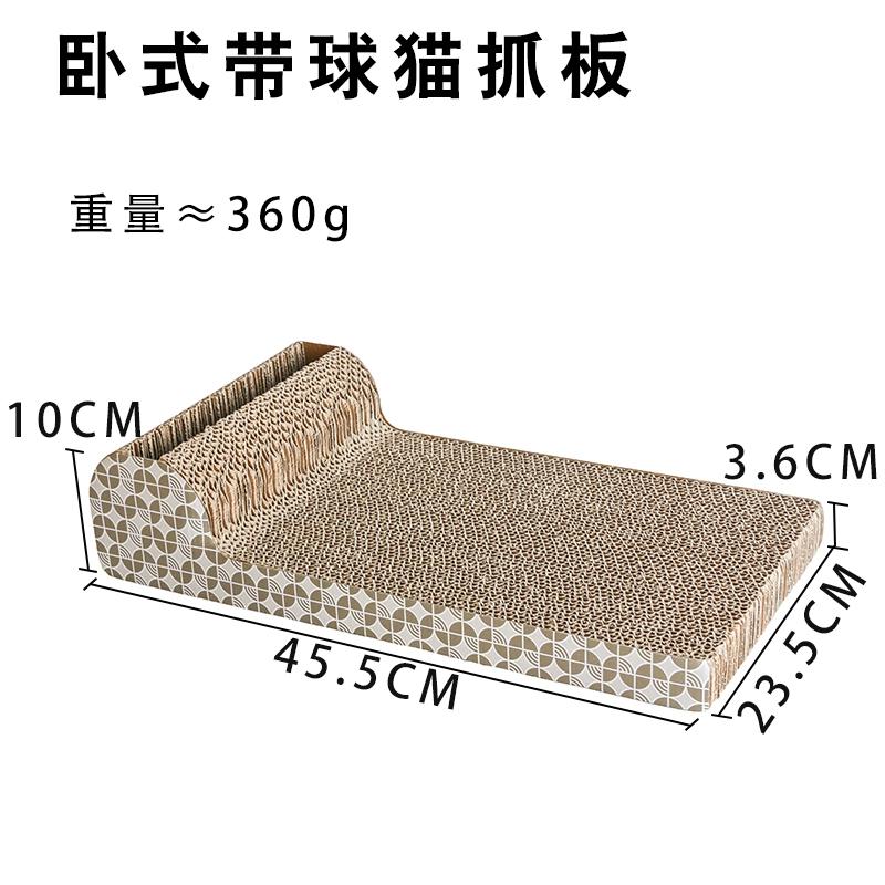Product: Horizontal cat scratch board with ball Item no: qbh-wsdqMain material: corrugated paper Product size: 45.5*23.5*10*3.6cm Weight: 0.4 kg 20 PC\CTNCarton Size:59.5*48.5*52.5cmG.W.: 9KG