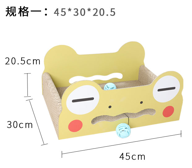 Product: Small frog cat scratch board Item no: QBH - YC - 712 Main material: corrugated paper Product size: 45*27.5*20.5cm Weight: 1.05 kg 1 PC\CTNCarton Size:46*29*8.5cmG.W.: 2.1KG