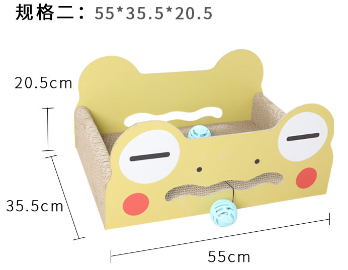 Product: Large frog cat scratch board Item no: QBH - YC - 712 Main material: corrugated paper Product size: 55*30.5*20.5cm Weight: 1.35 kg 1 PC\CTNCarton Size:56.5*32*8.5cmG.W.: 2.4KG