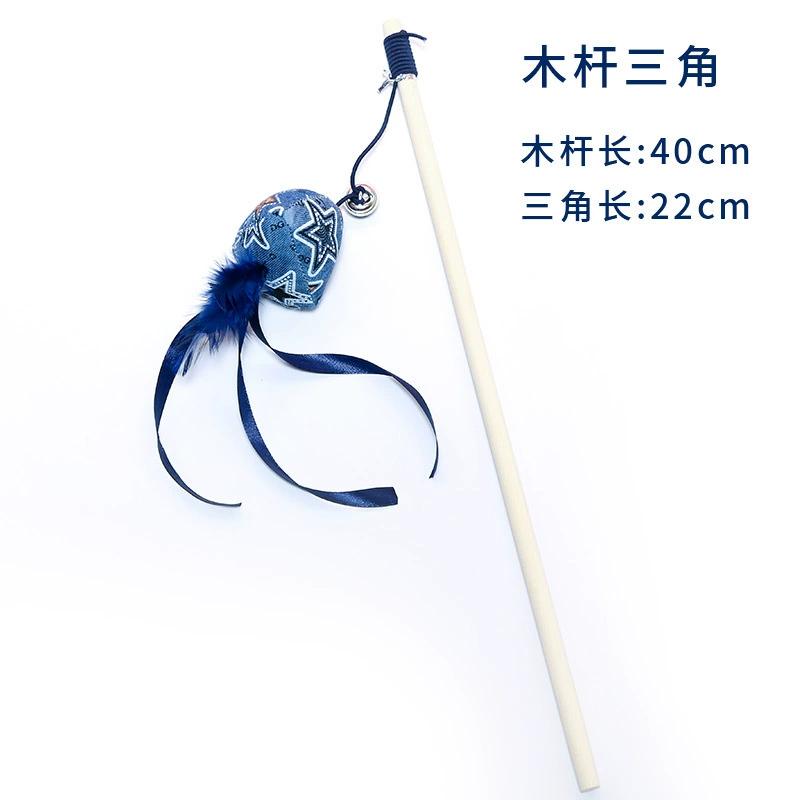 Product: Wooden pole triangle cat stick Item no: QBH - 12142 Main materials: canvas, wood pole, feather, bell Wooden poles: 40 cm Triangle length: 22CM