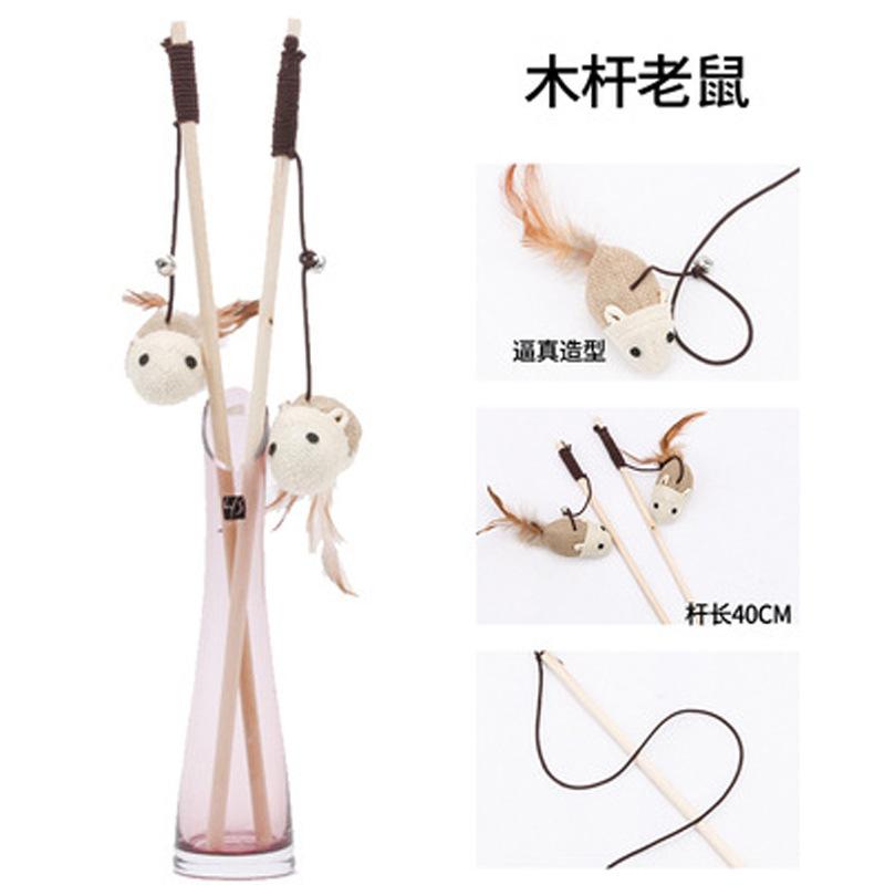 Product: Wooden mouse tickle stick Item no: QBH - 511 Main material: wooden pole, bell, canvas doll Length: 40 cm Weight: 30 g