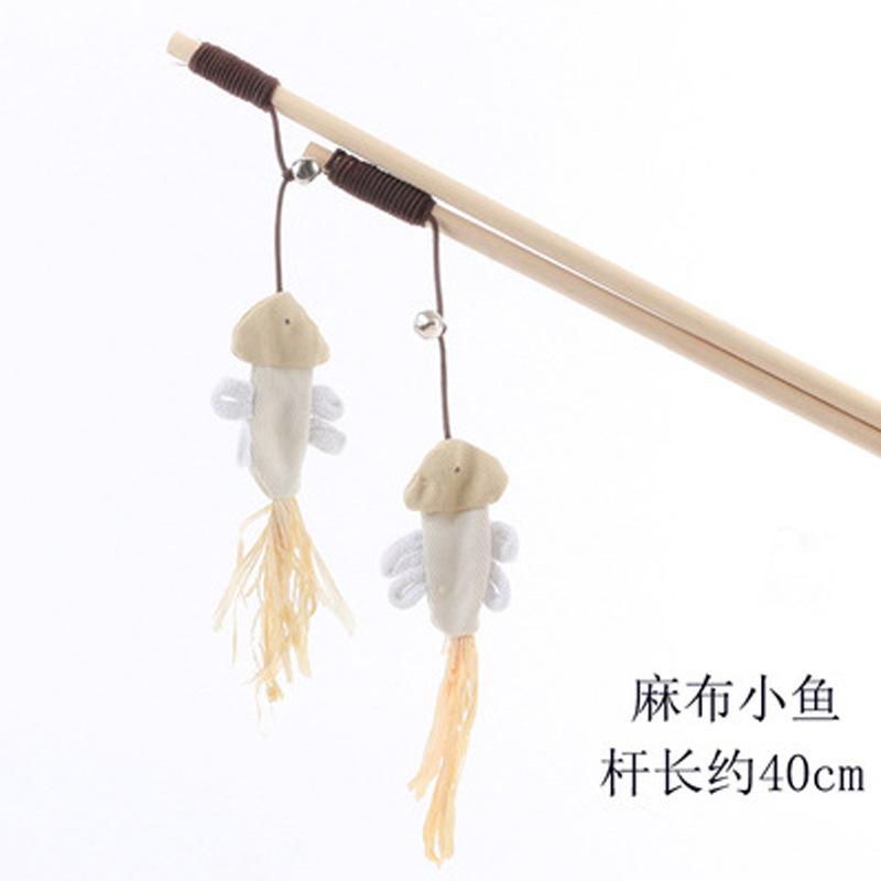 Product: Linen Fish tease cat Stick Item no: QBH - 511 Main materials: wooden pole, bell, canvas doll Length: 40 cm Weight: 30 g