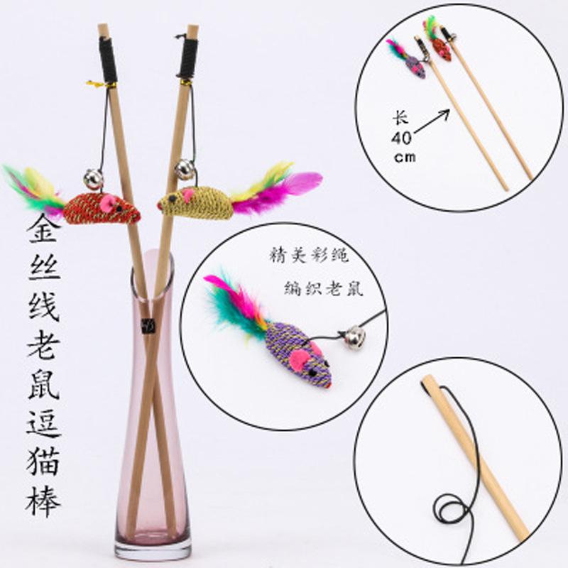 Products: Log gold wire rope mouse tease cat stick Item no: QBH - 524 Main materials: Wood handle, twine mouse, bell, chicken feathers Handle 40 cm long